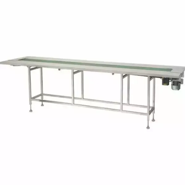 The Packing Belt Conveyor has a stainless steel Table Top in the centre with a moving Endless Sandwich Belt. The tabletop is attached to the same structure, which is made of SS 304 square pipe and is held in place by adjustable bolts. For final visual examination and packing into the box, the tabletop has a 300MM working space on both sides of the conveyor belt.